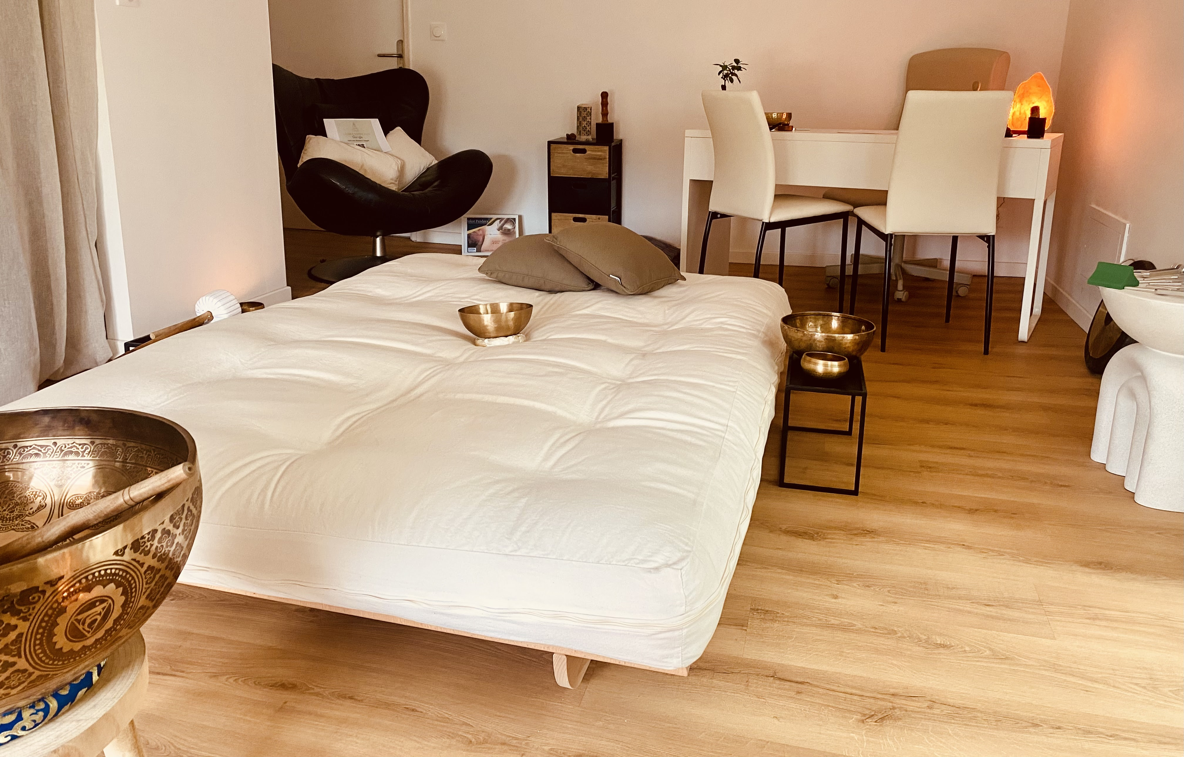 Pour vous guider dans ce voyage intérieur, j'ai sélectionné avec le plus grand soin des instruments sonores d'exception. Au cœur de ma pratique se trouvent les bols tibétains ancestraux. Leurs sons riches et complexes offrent un massage sonore inoubliable ; la séance de sonothérapie avec les bols chantants est une expérience enveloppante, un retour aux origines. J'utilise également des bols thérapeutiques spécifiques et des bols cristallins, dont la pureté de la fréquence vibratoire élève l'esprit et purifie l'aura. Les diapasons thérapeutiques viennent compléter cette symphonie, permettant un travail d'une extrême précision pour un équilibrage sonore ciblé et un réalignement vibratoire délicat. Chaque instrument est un allié précieux dans cette quête d'harmonie.